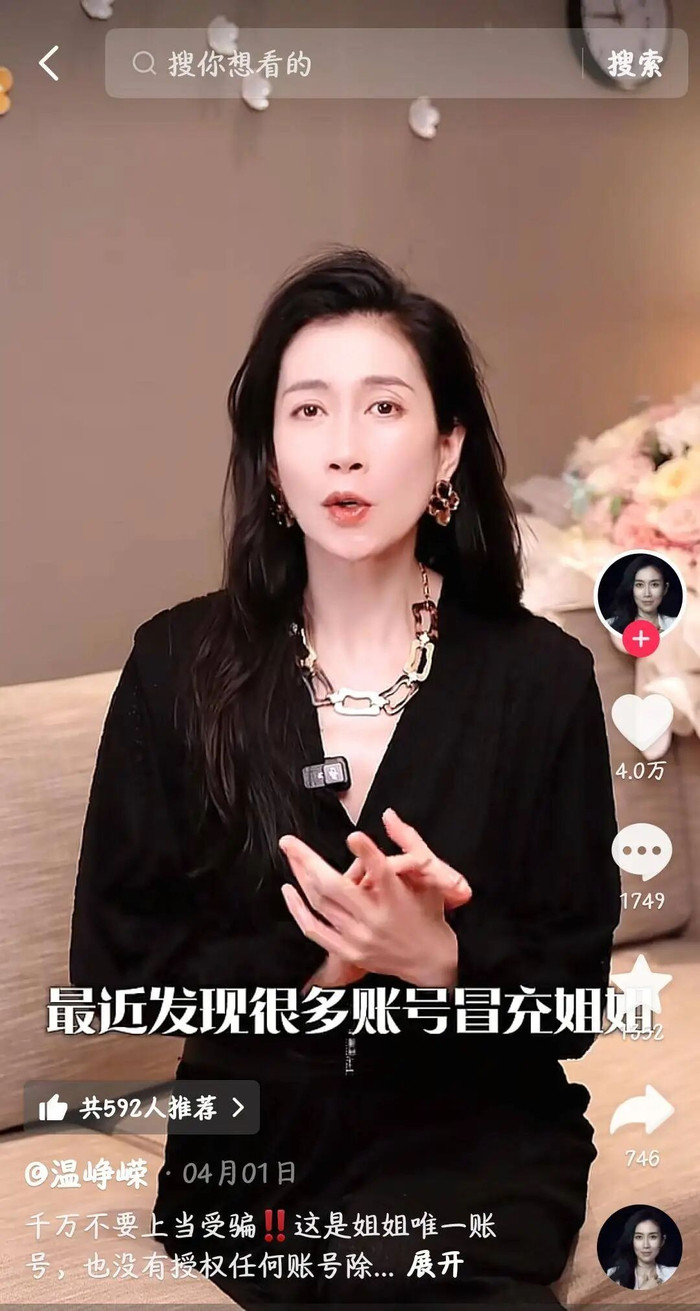 今年4月1日,温峥嵘发视频打假,明确地表示自己只有一个账号直播,她和团队也注意到了有很多账号冒充她开直播、打广告,她也支持粉丝看到了盗播的直播间进行举报。